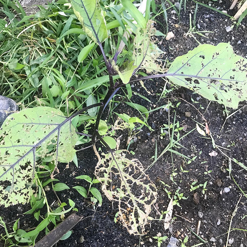茄子の葉がほとんど虫に食われて葉脈しか残ってない。