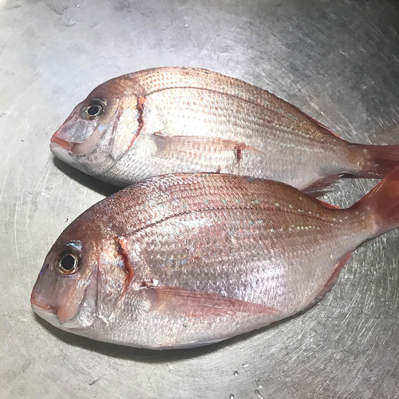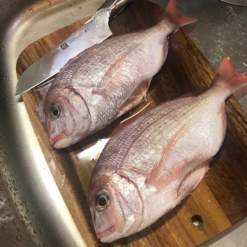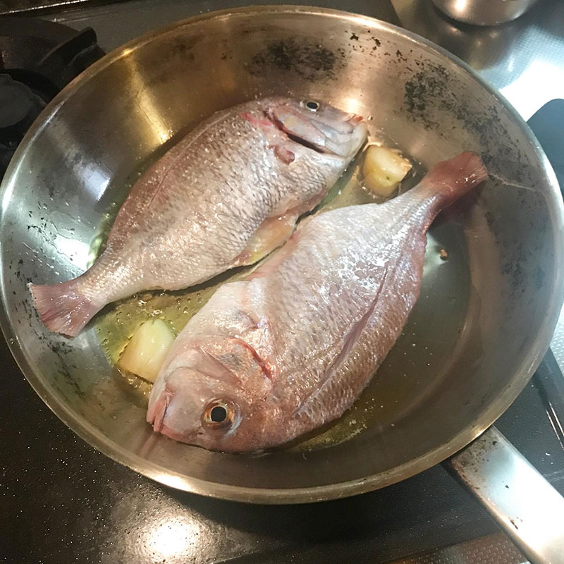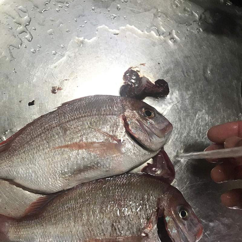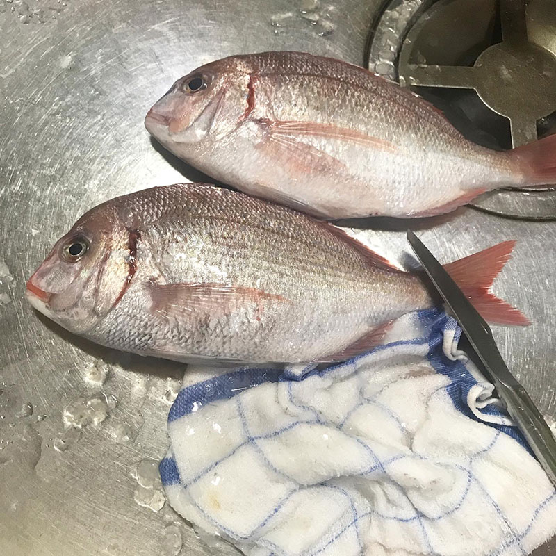 今宵のアクアパッツァのために鶴岡で買ってきた真鯛の下処理。