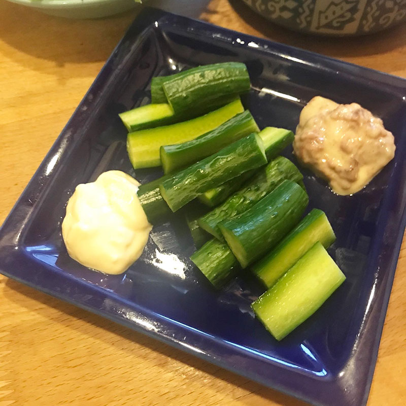 畑のサラダ。きゅうりは若い小さいのを収穫。柔らかくて美味しい。自家製マヨネーズと梅干しを叩いて混ぜたりもして。