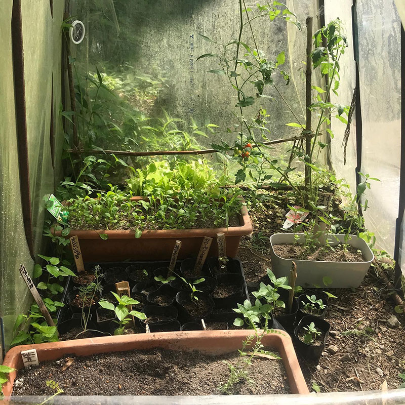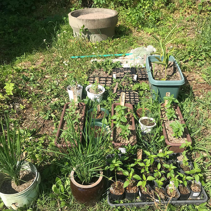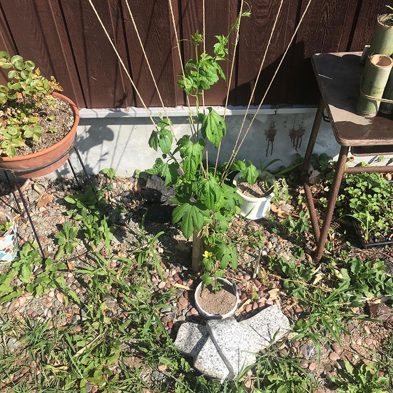 ポットで育ててる万願寺とうがらしやバジル、プランターの月桃