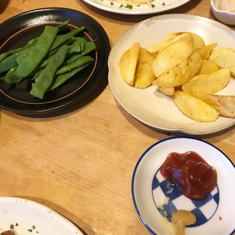 フライドポテト、畑のサラダ、きゅうりのぬか漬け、モロッコいんげん。