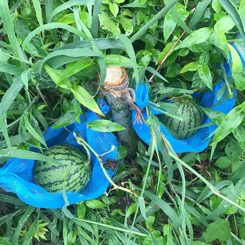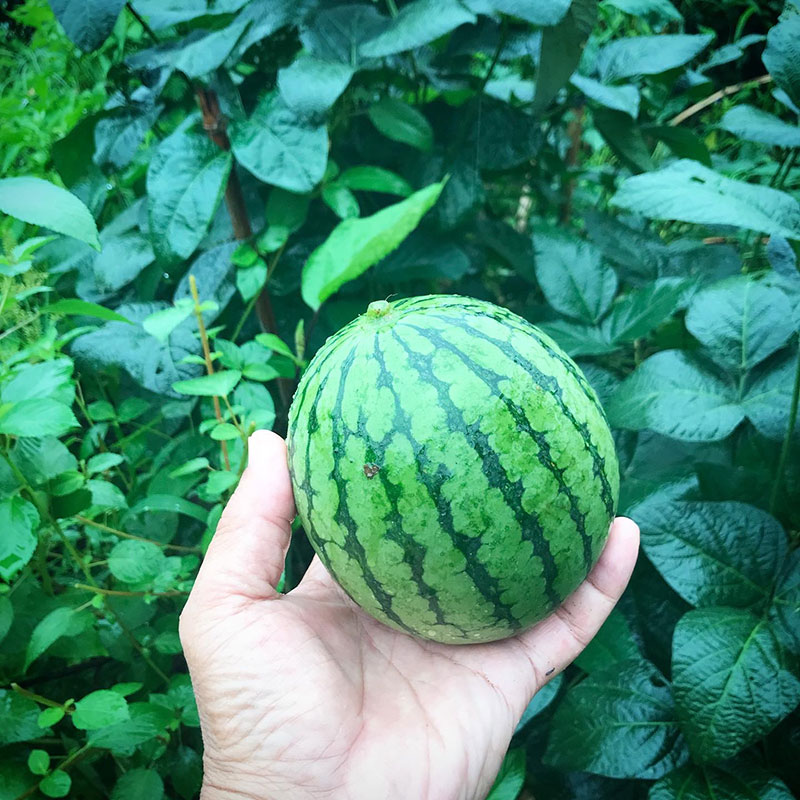 土手のスイカ。ひとつ収穫する。