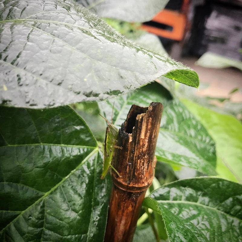青豆の葉で雨宿りするイナゴ。