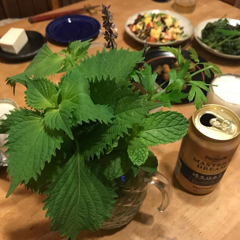 好みでいろいろ使えるように香草を食卓に。大葉、ミント、イタリアンパセリ、パセリ、ホーリーバジル。。。