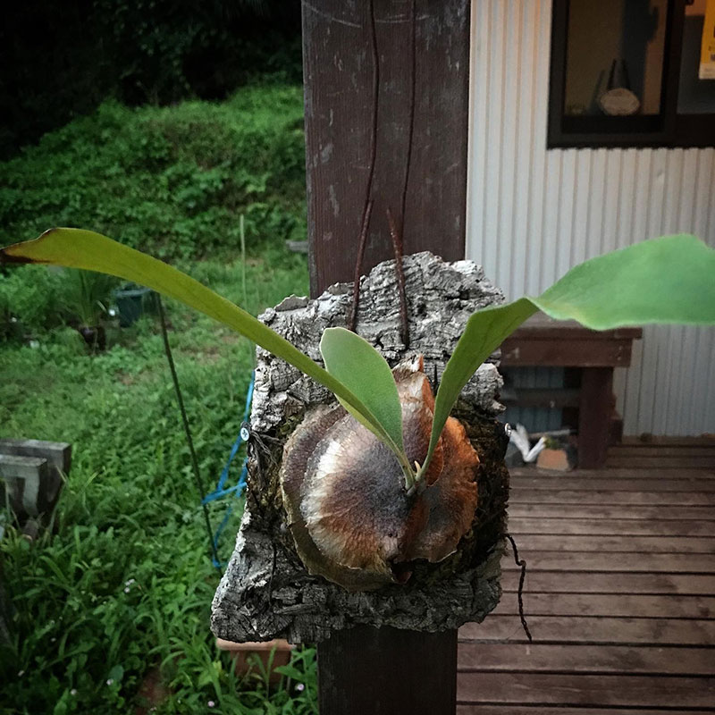 玄関のコウモリランにイキイキした小さな新しい葉が生えた。