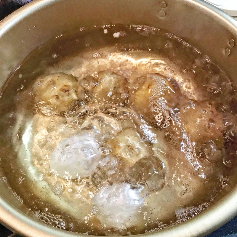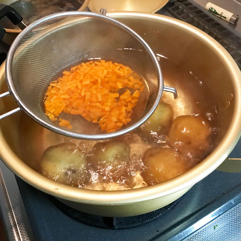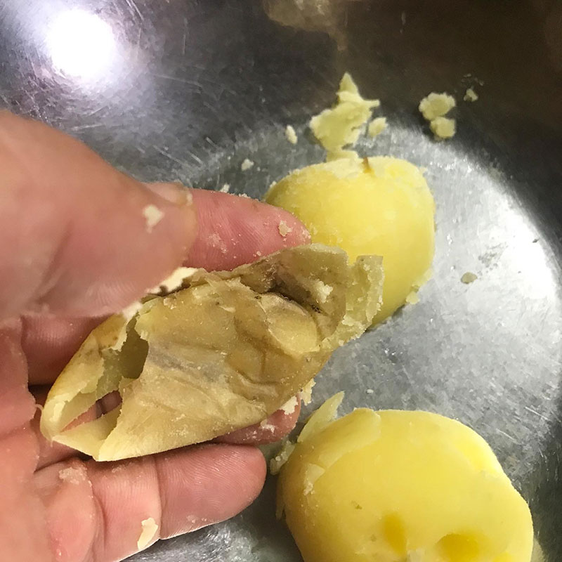 じゃがいもの皮のすぐ下が美味しいので皮は剥かずに茹で上がってから熱さと戦いながら皮をずるっと剥いて芽をとっていく。