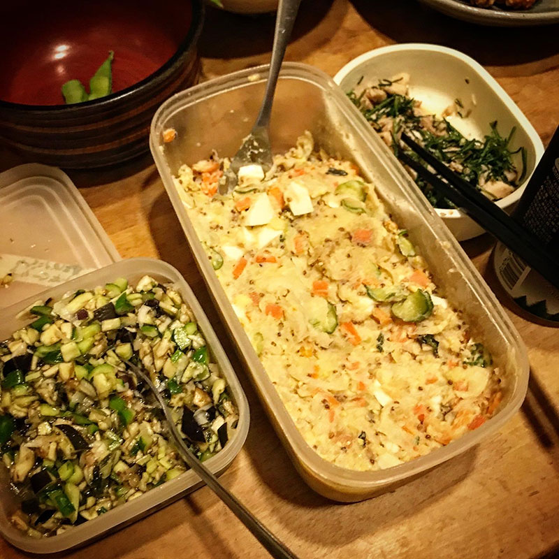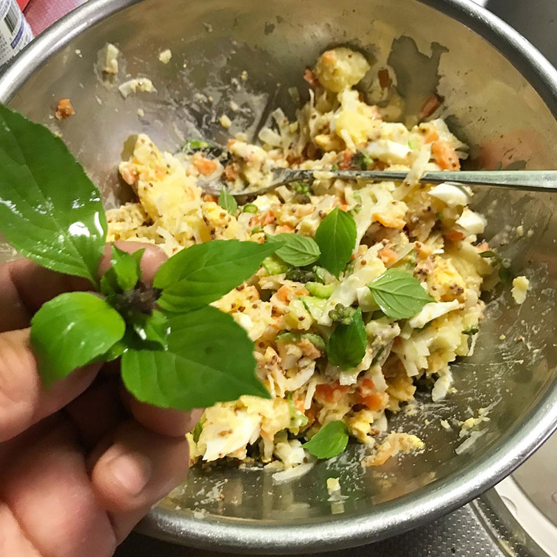 早朝仕込んだポテトサラダ、おかひじきとツナのナムル。ポテトサラダにはホーリーバジルの花芽と葉も入ってるけど追い葉っぱで食べるのも美味しい。