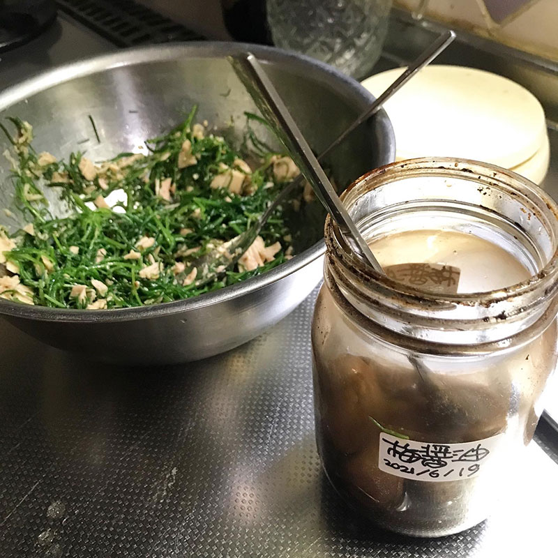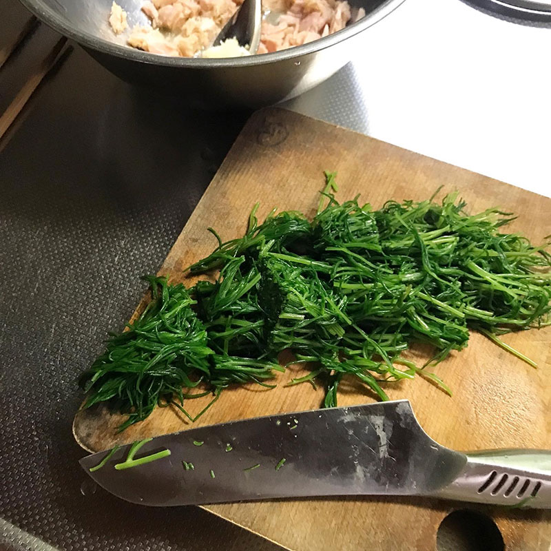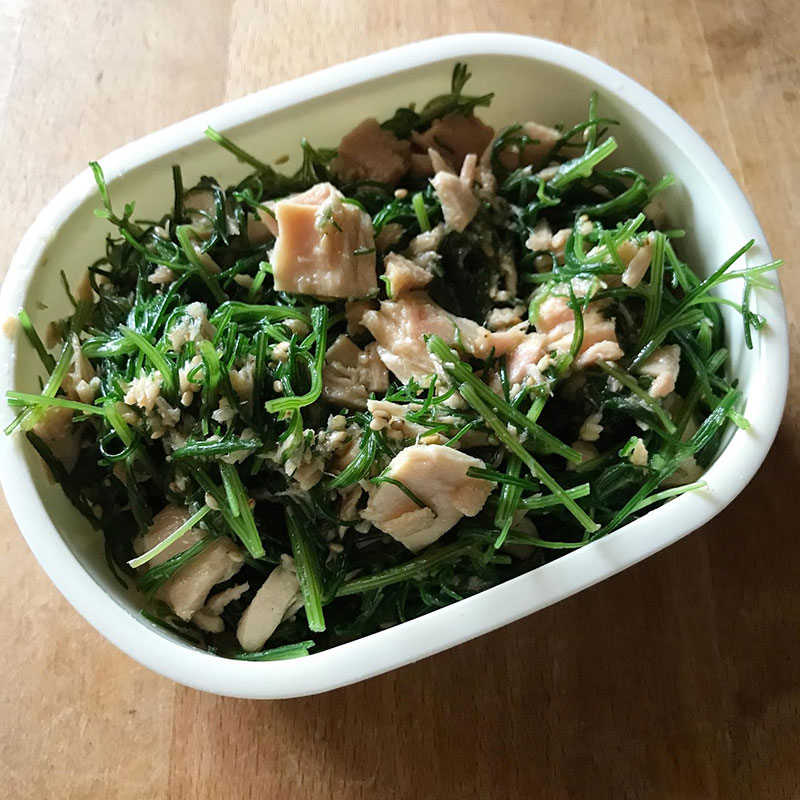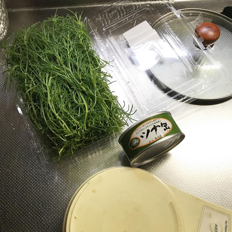昨日、山元町でおかひじき買った。母親にもらったオリーブオイル漬けのツナ缶があったので、