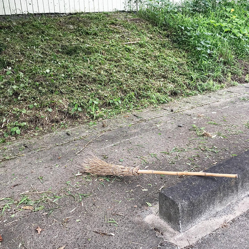 我が家は日々の生活に追われ限界になった時にしかやらないので土手やその前の道路の舗装のヒビから草が生えてしまう。一気に刈って竹箒で履く。