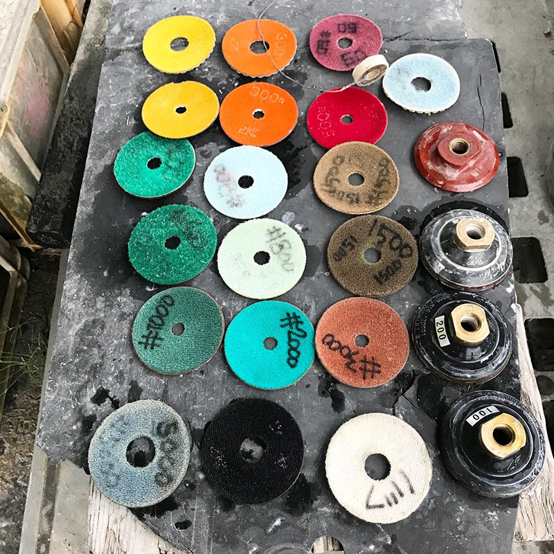 磨きのパッドはこれだけの種類が必要。磨く物の素材や形、大きさによっても使い分けるしどれ釜欠けても次の段階に進めなくなる。