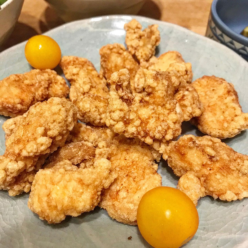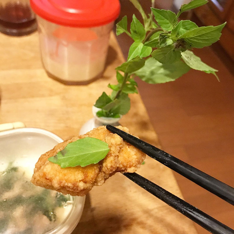 鳥の唐揚げに葉っぱ一枚乗っけて食べのも最高。何にでも一緒に。