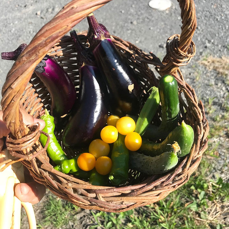 今朝の収穫。茄子、ミニトマト、きゅうり、オクラ、万願寺とうがらし。
