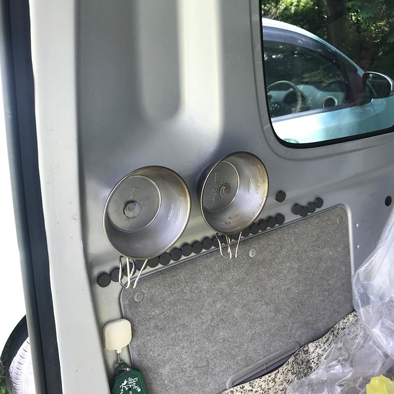 シェラカップはいつも車に磁石で2人分とめてある。