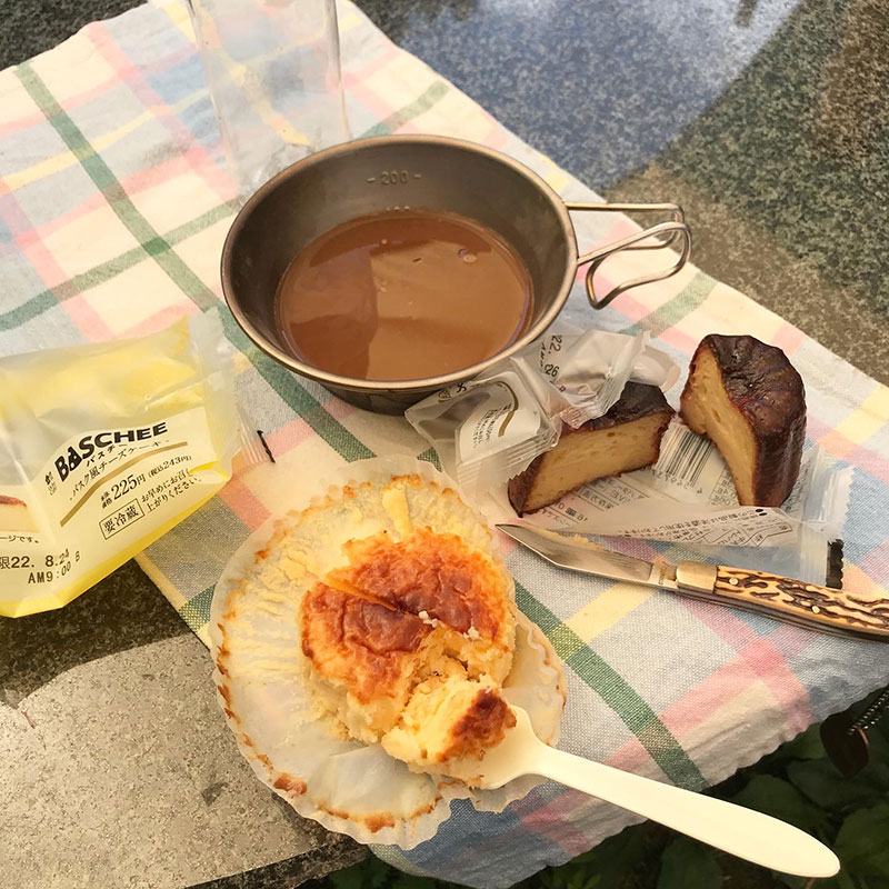 最後の晴れに仕事場の石テーブルでランチしようとカミさん。少し昼寝してお茶。ローソンのカヌレとバスク地方のチーズケーキバスチー、買ってきてくれた。
