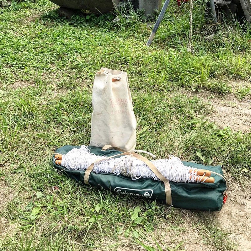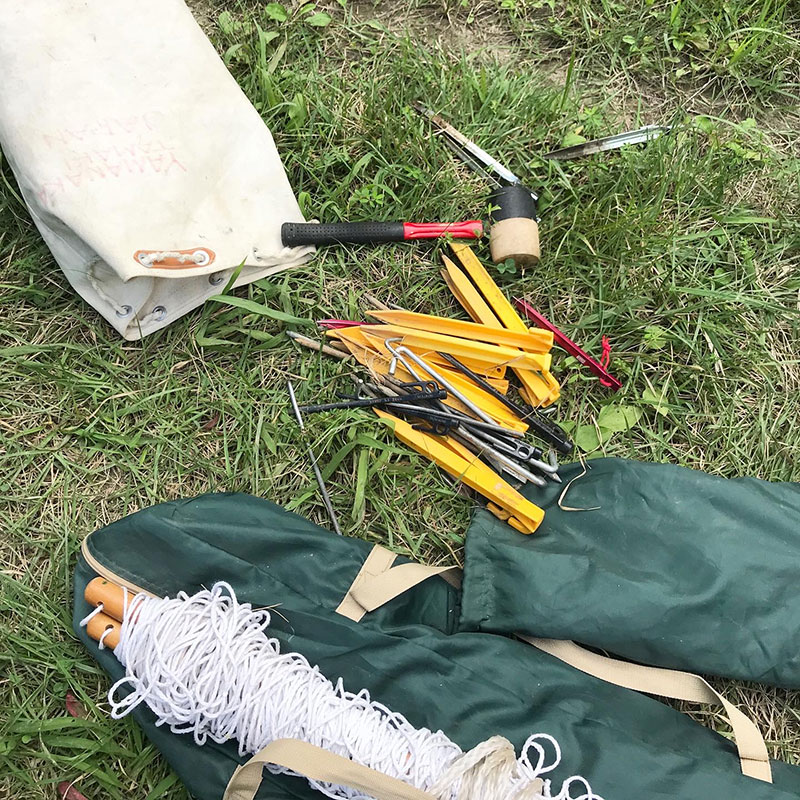 テントやタープなど諸々のペグは布の袋にまとめて収納してる。ペグ大臣。各種いろんな長さのペグを取り揃えております。