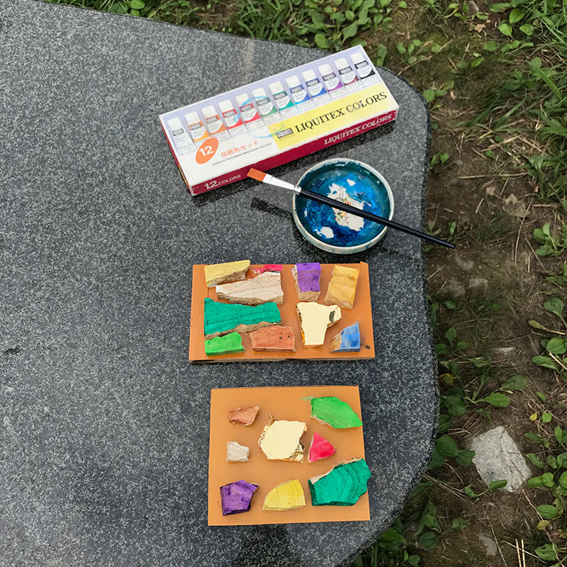 午前中は天草木目石をいろんな色に染めたり額縁作りの木工仕事。