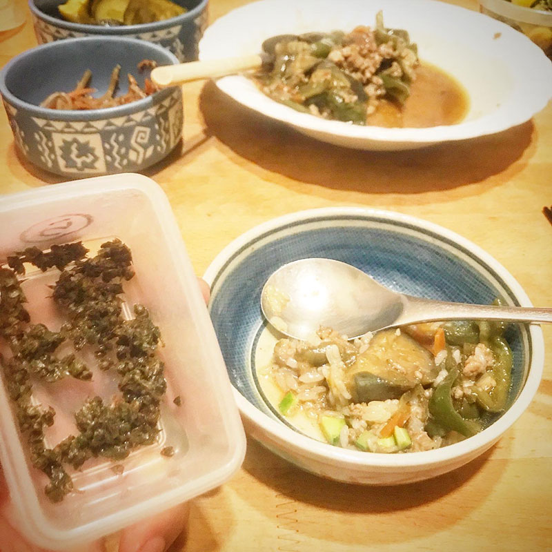 この時期何にでもかけてるホーリーバジルの花芽の塩漬け。麻婆茄子にもかけると華やかな香り。