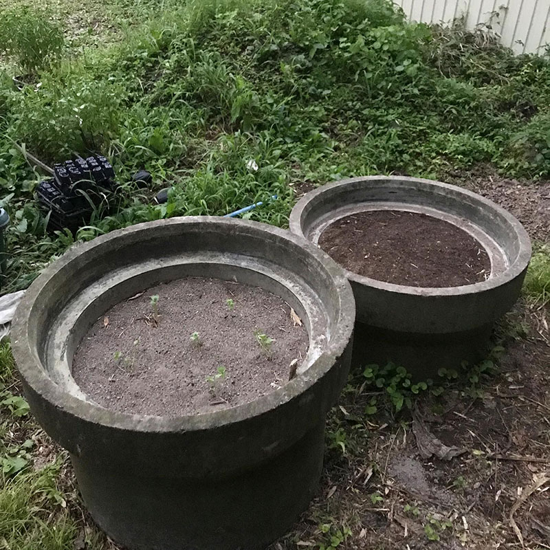 土管に土をふるい入れた土管畑に3日前にまいた白菜の種、通称土管白菜w が発芽した。