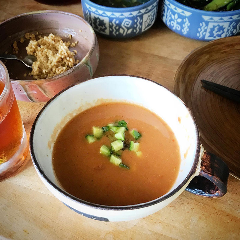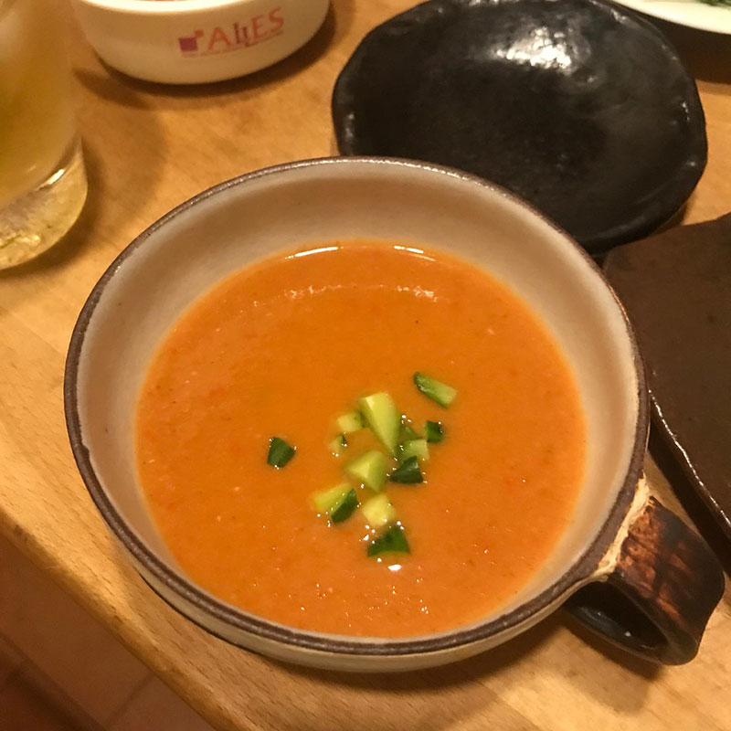 朝から30℃超え。すでに汗びっしょり。冷たい一杯のガスパチョが沁みる。