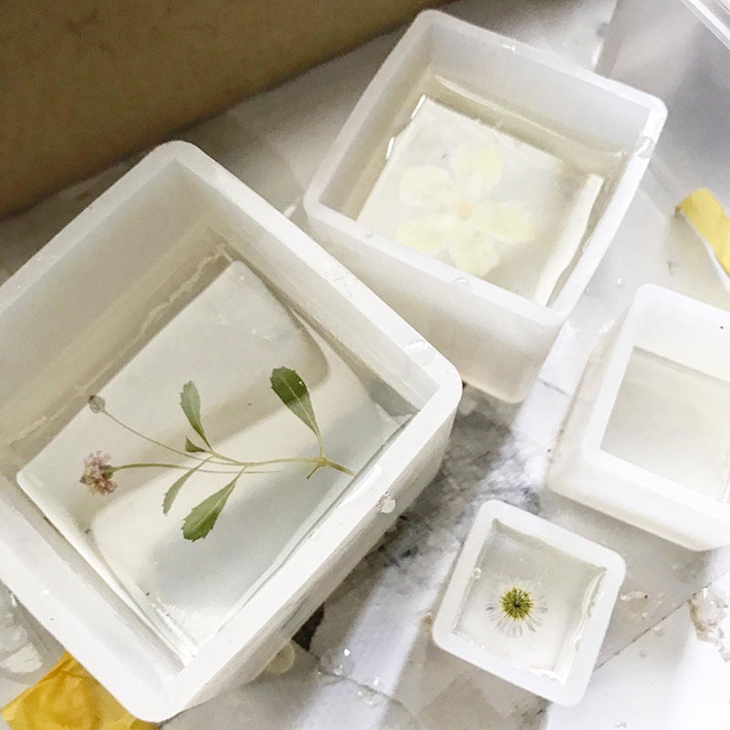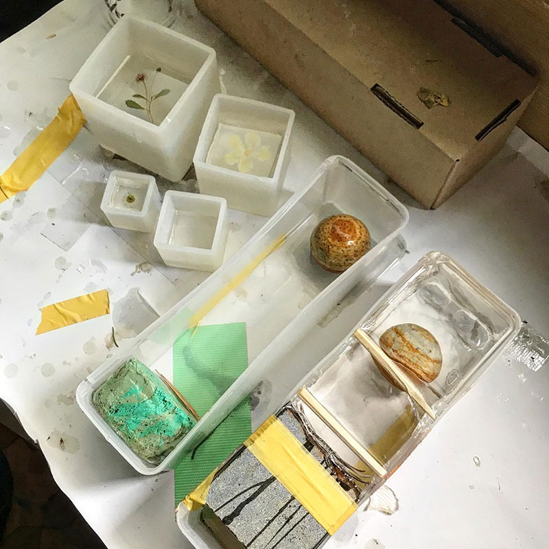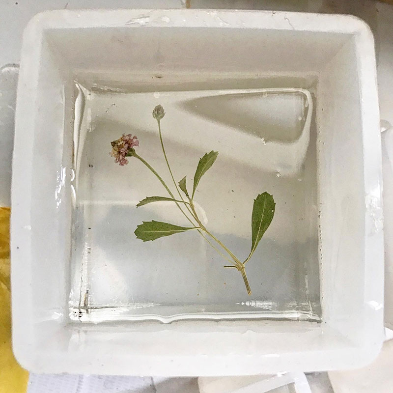 最後、もうあまり缶に残ってないのがわかってたので小さな型に家に咲いてたヒメイワダレソウとゴーヤの黄色い花、仕事場の小さな小さな花を透明樹脂に封印した。