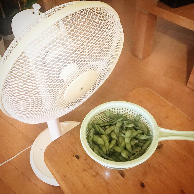 産直で買った枝豆、扇風機が出てるのでうちわじゃなくて楽に急冷出来る。