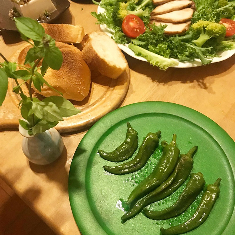 畑の緑の万願寺とうがらしを、あえてまるもん屋さんの美しい緑の漆の器に。