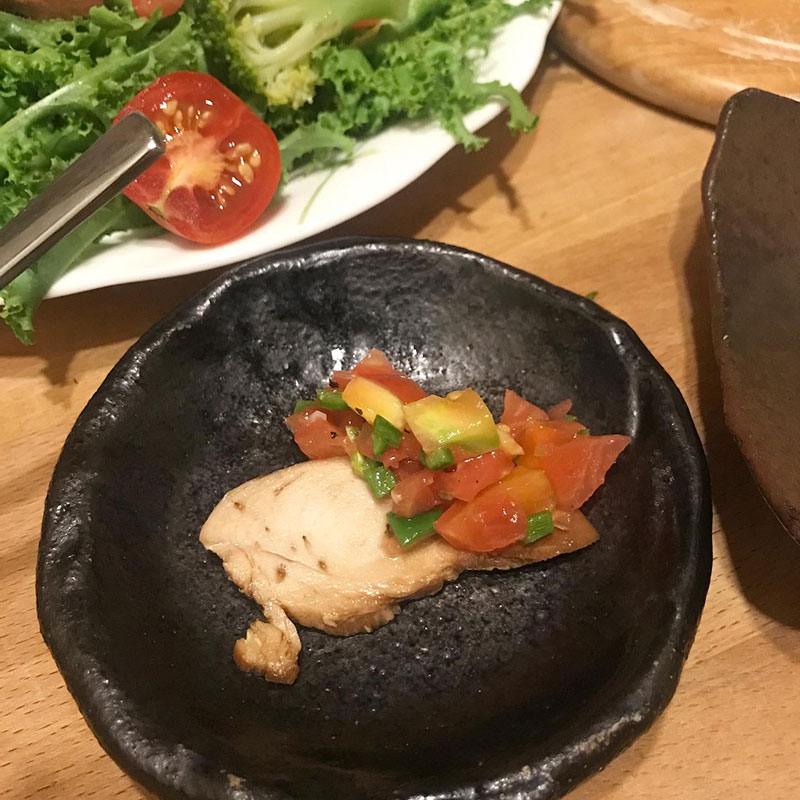 カミさんが作ってくれた鶏肉の土鍋煮を畑からサラダ用のリーフ摘んできて乗せた。