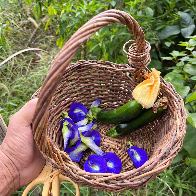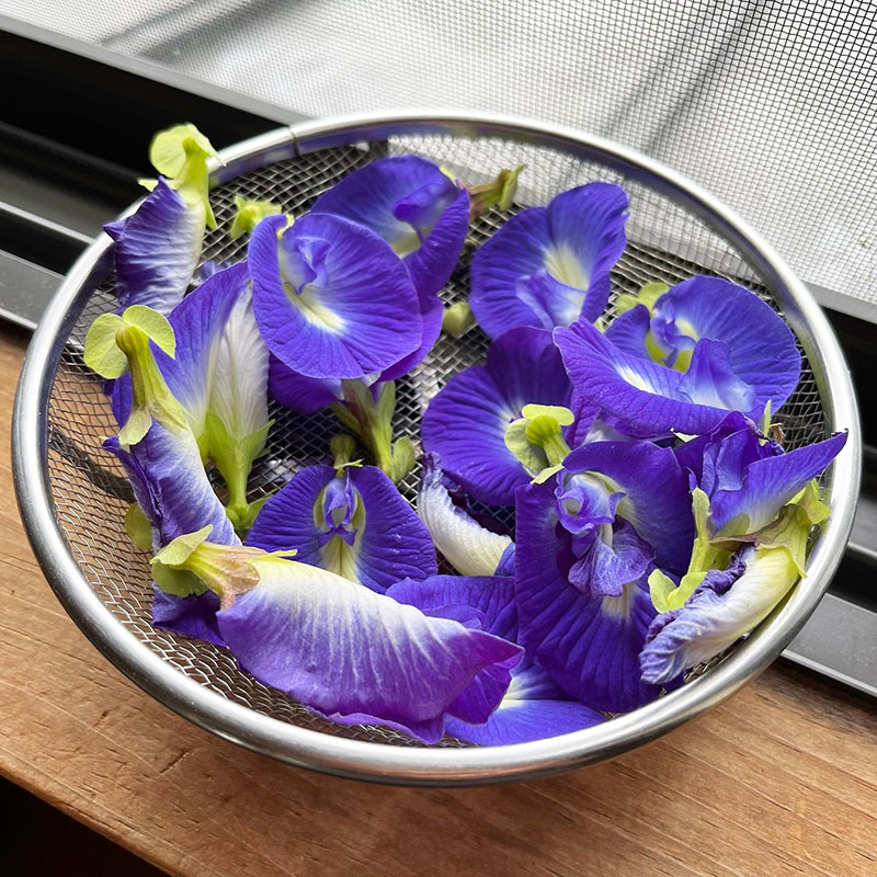 ハーブティーを青く染めてくれるバタフライピーの花、摘んでは乾燥させてずいぶんたまった。