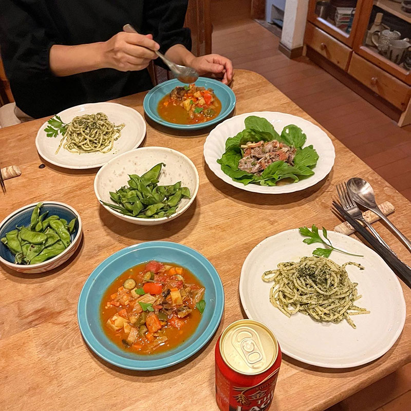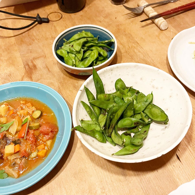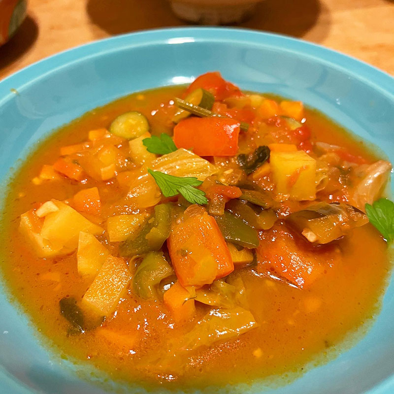 昨日畑や冷蔵後の野菜を切っては入れて作ったラグー(野菜の煮込み)。