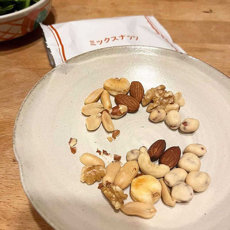 先日、泊まりに来てくれた恵さんがおいていったミックスナッツ。全部半分に分けていただきました。