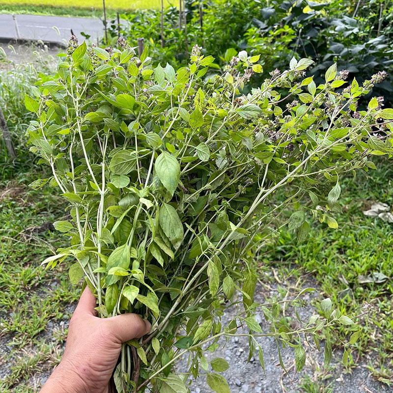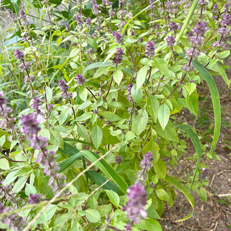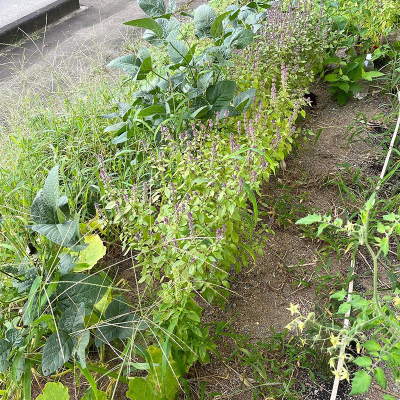 土手に植えたホーリーバジルの葉が
