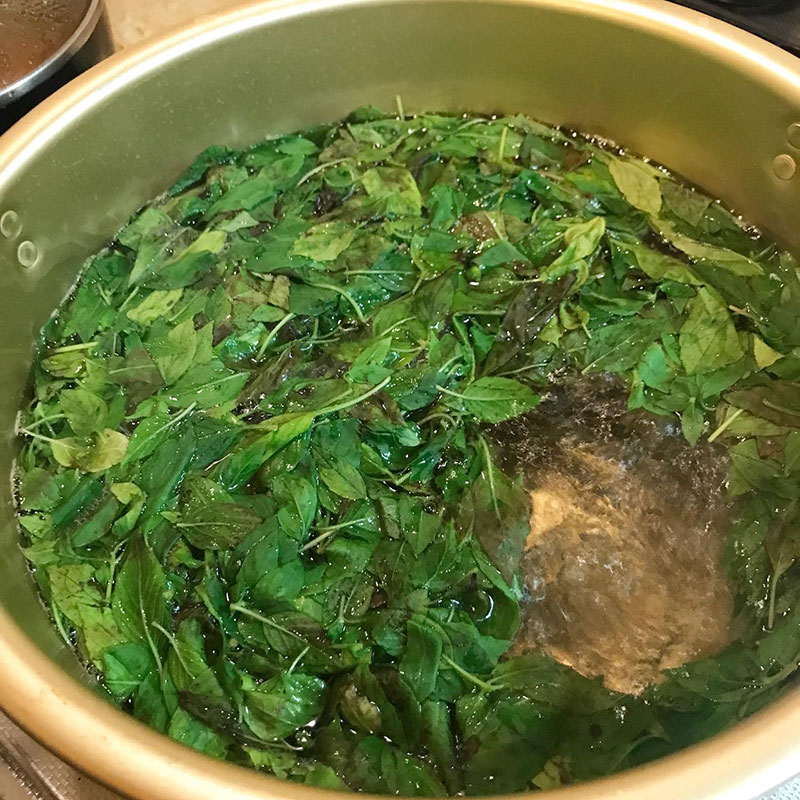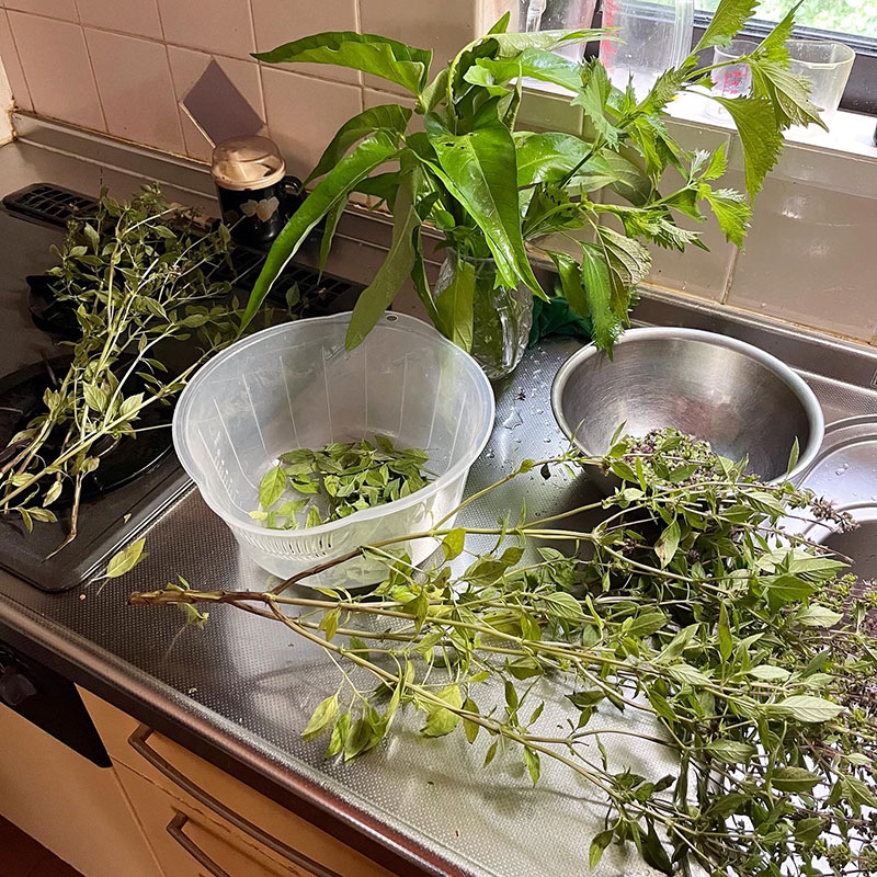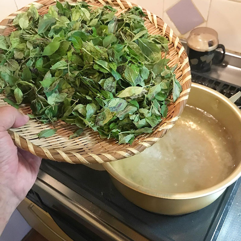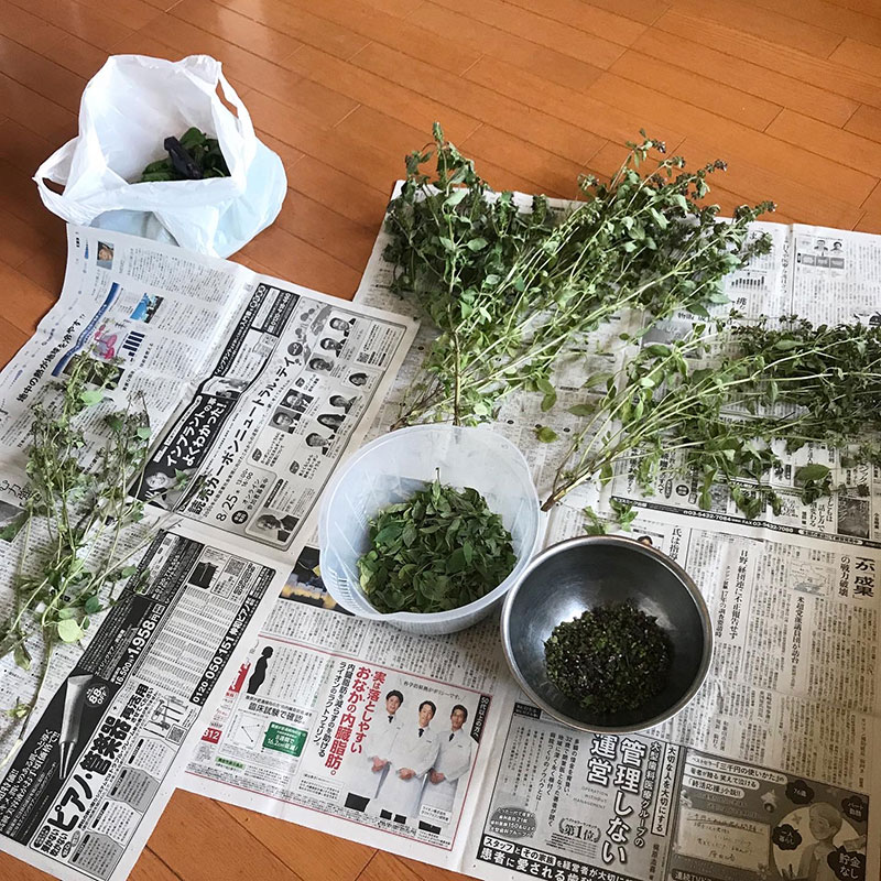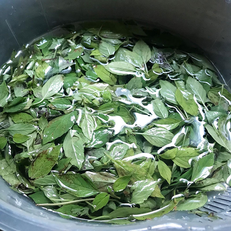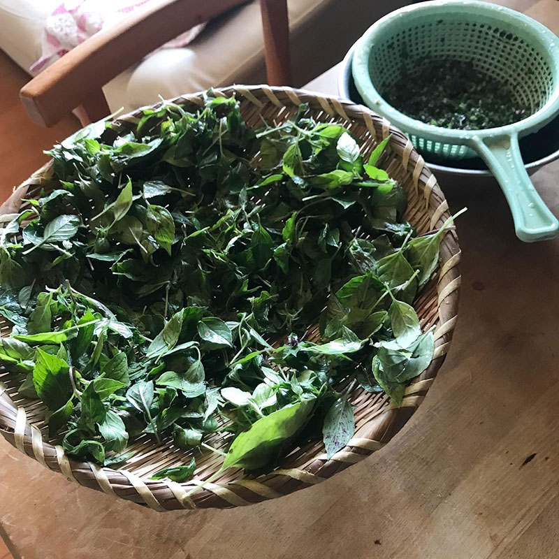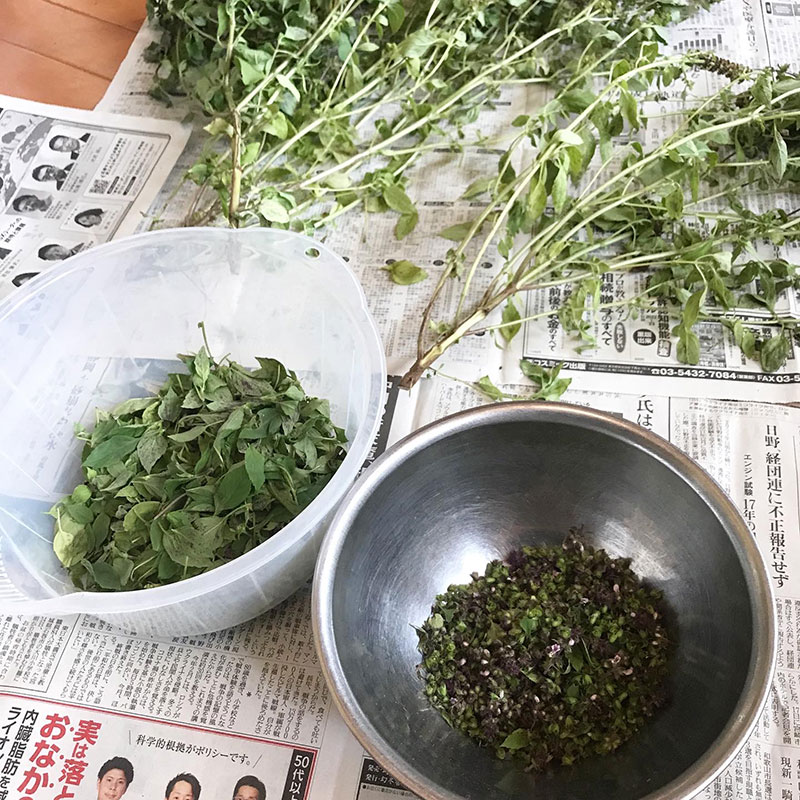 洗ってザルに上げておいた干しホーリーバジルの葉で