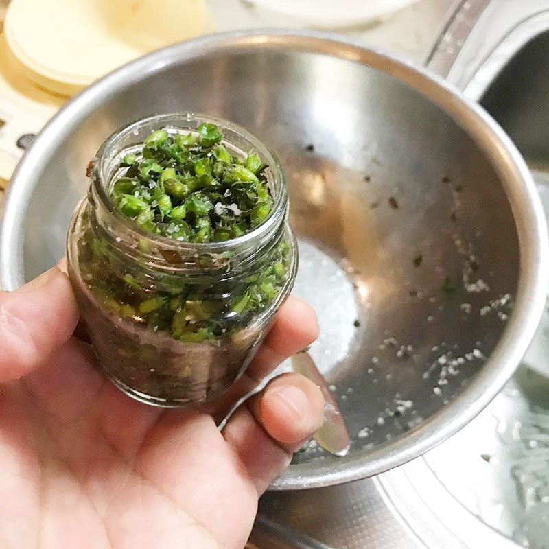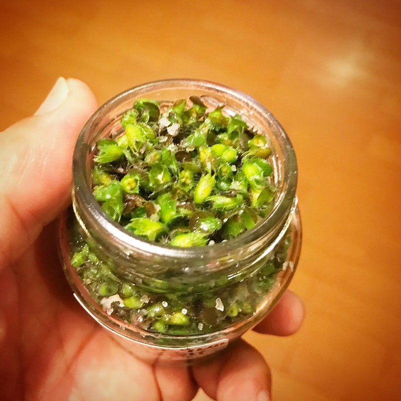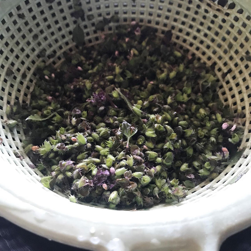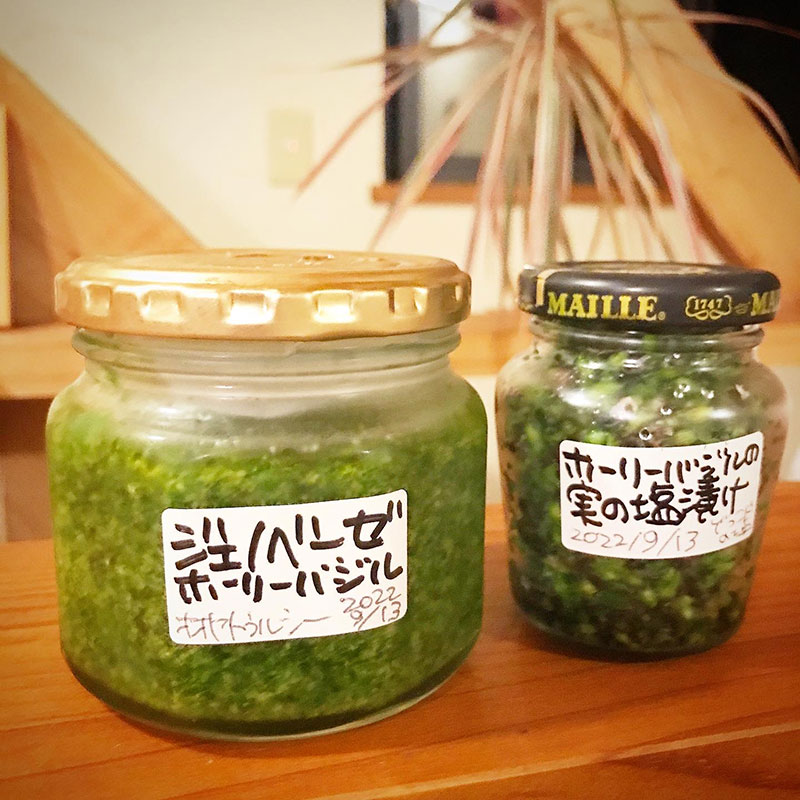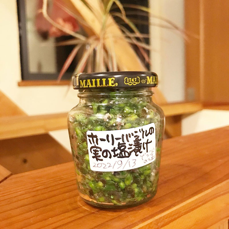 ホーリーバジルの実も葉を茹でたお湯で30秒茹でて水気を切って10%の塩で塩漬けに。