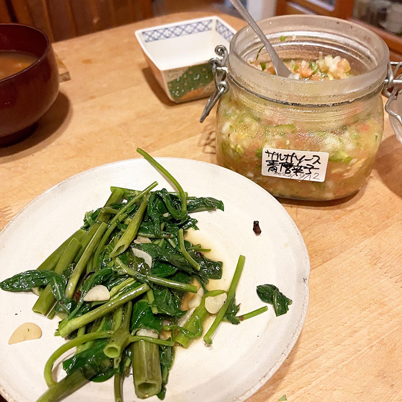 夕食に畑の空芯菜炒めた。食べ続けてるのに飽きない。