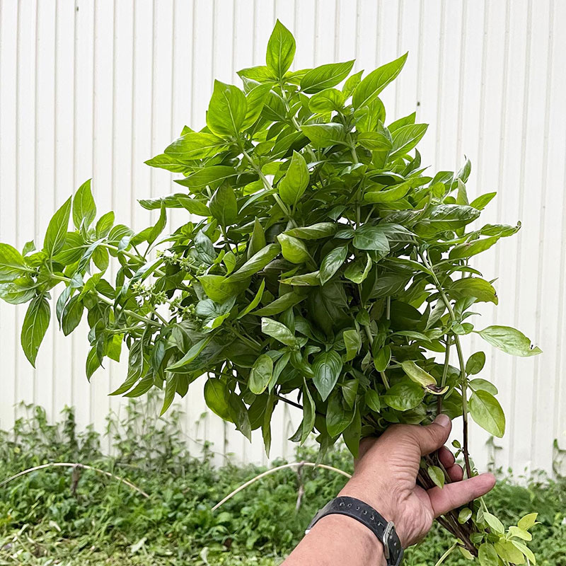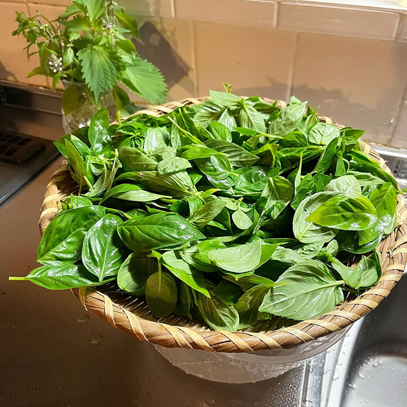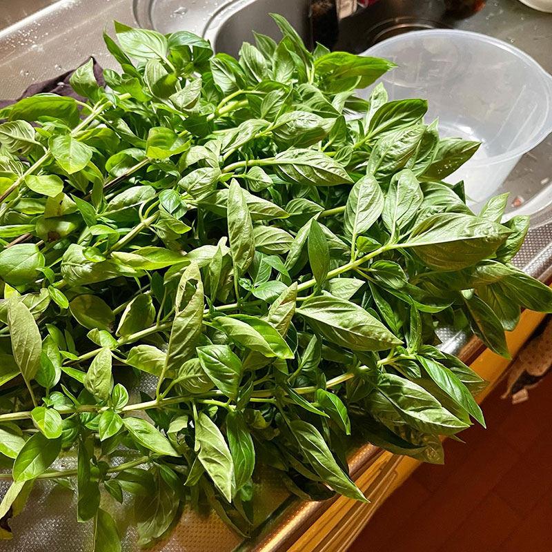 畑からはブッシュバジルを山盛り収穫。
