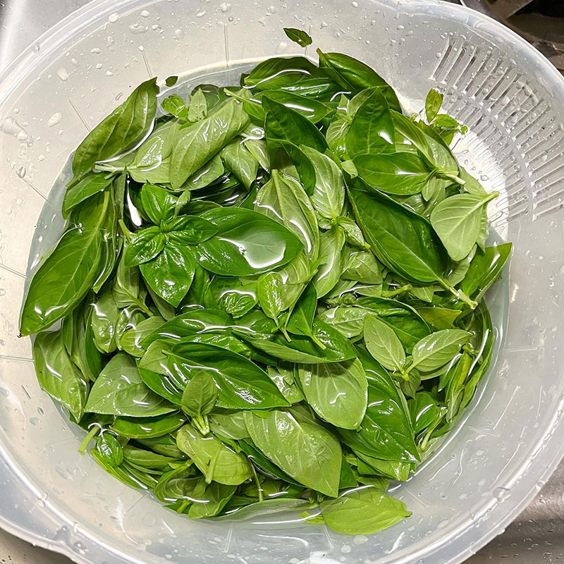 きれいな葉をちぎって洗って明日までザルに上げておく。ハンドブレンダーを冷蔵庫で冷やしておく。