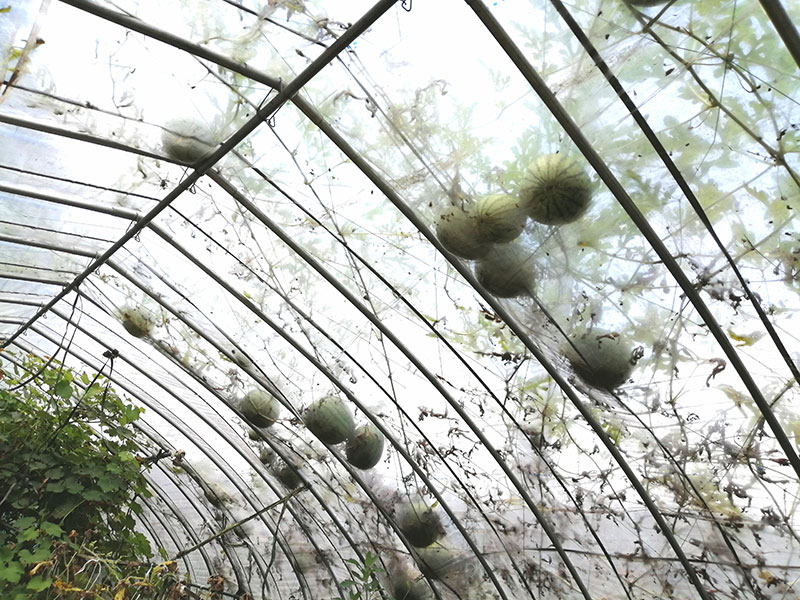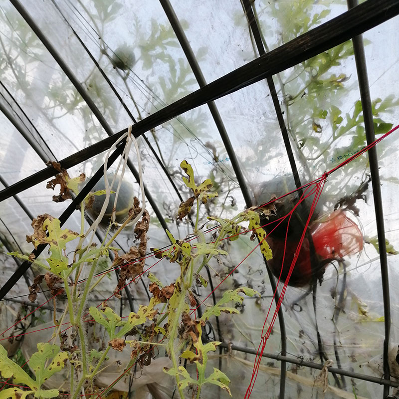 よく野菜をくれる近所の方のスイカ栽培法。ハウスの中に植えて少ない水で甘く育ててる。