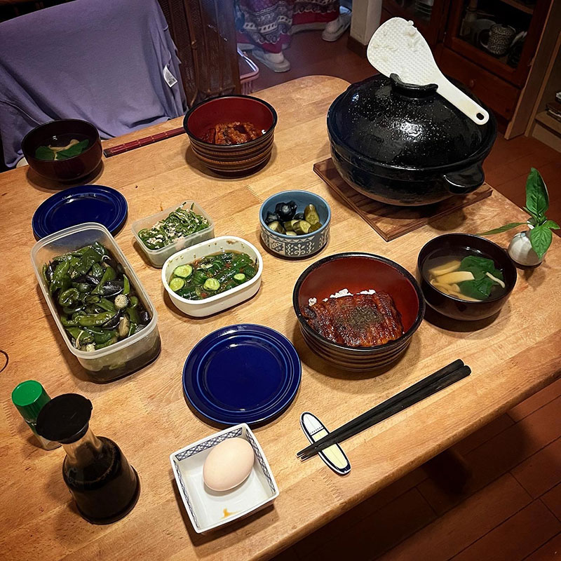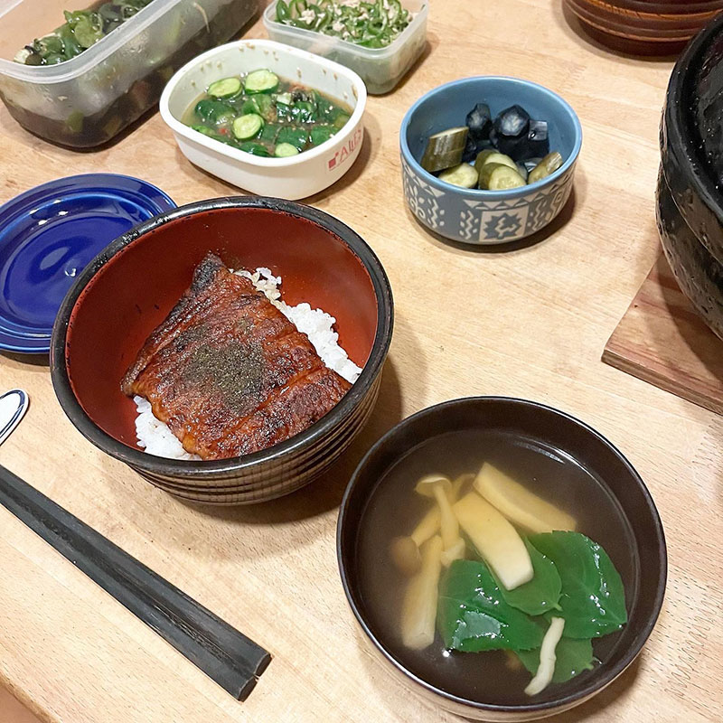 味噌汁あったけどうなぎはお吸い物で食べたい、とわがままを言ったら作ってくれた。畑からモロヘイヤの葉を摘んできて浮かべた。