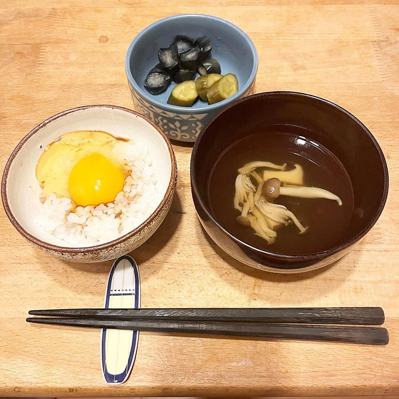 いつもはご飯半膳。おかわりもしないんだけど新米の時は特別。常温に戻しておいた卵で卵かけご飯。きゅうりと茄子のぬか漬け。