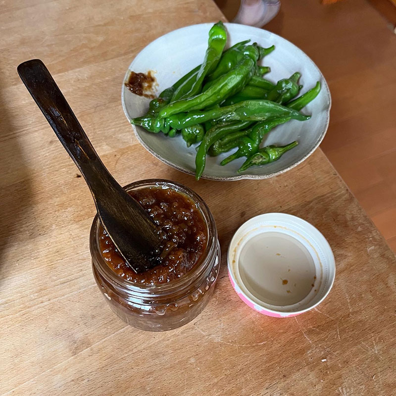 ピーマン、青唐辛子、麹、醤油、ザラメなどで作ってるらしい甘辛い味噌、今年もいただいた(嬉)