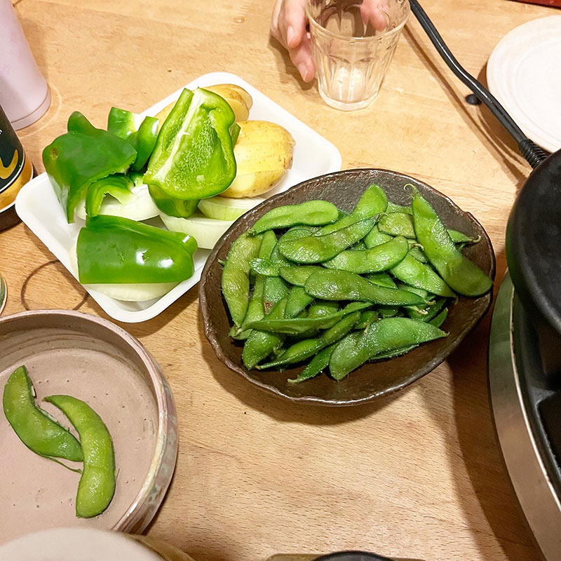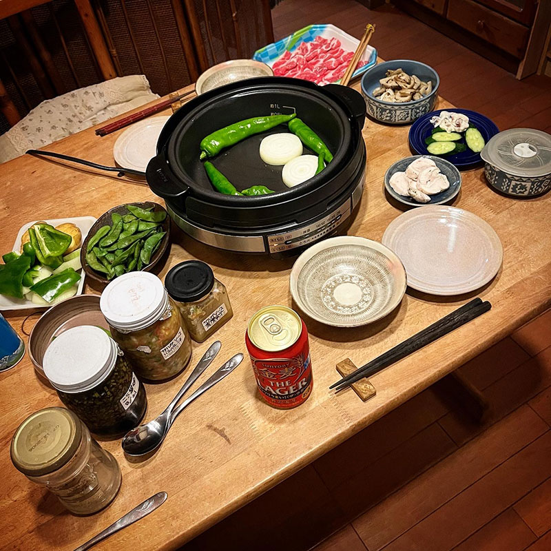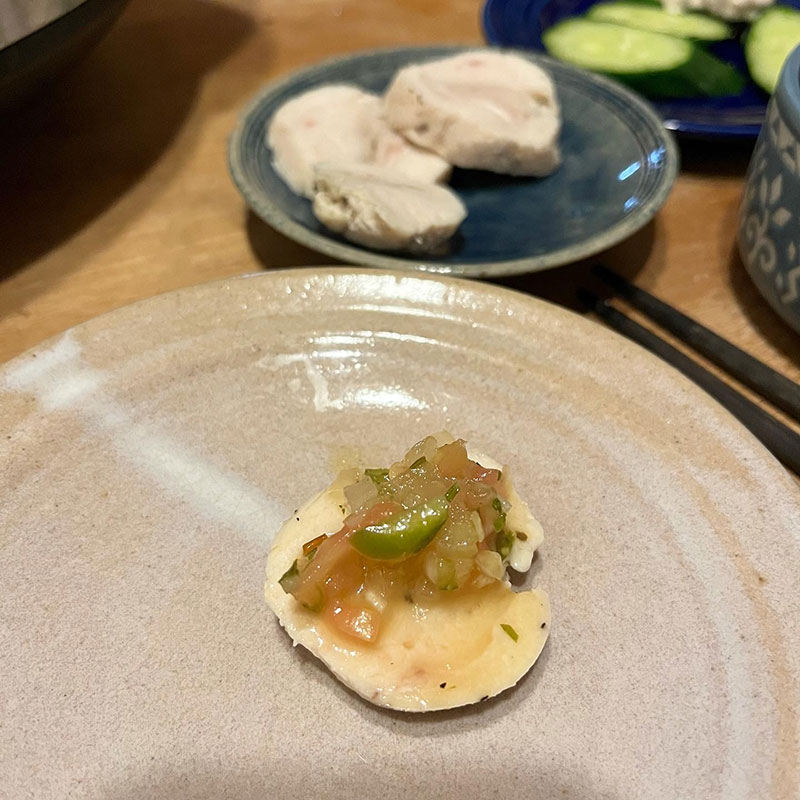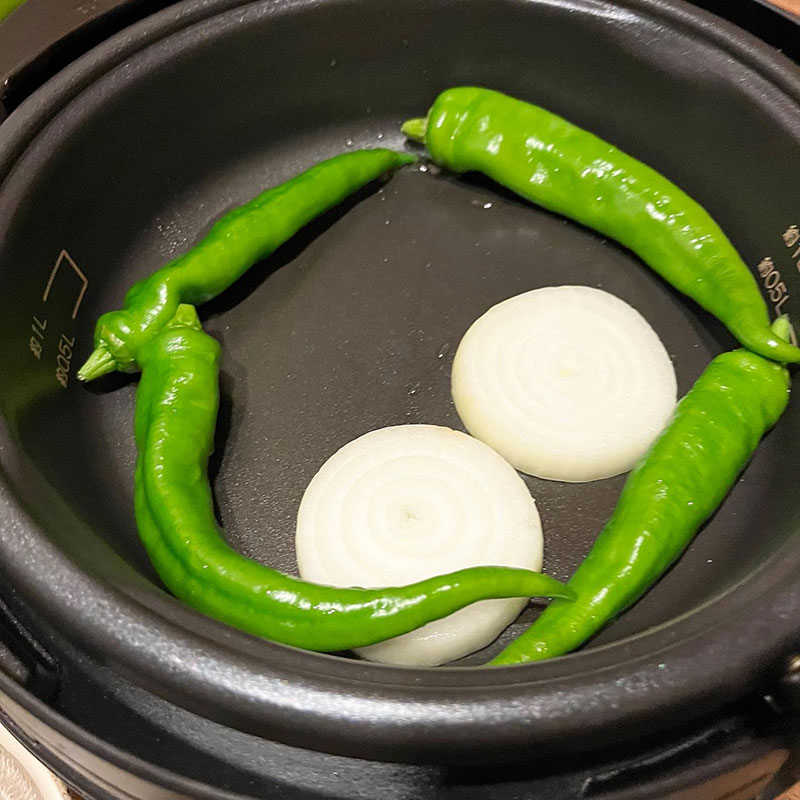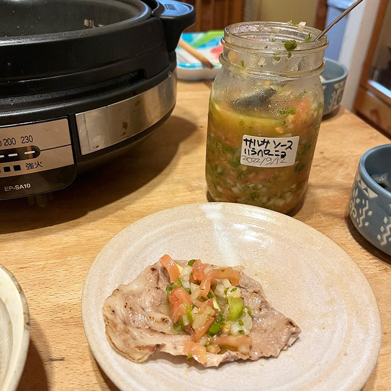 豚肉を焼いて青唐辛子やハラペーニョで仕込んだ