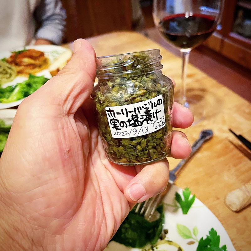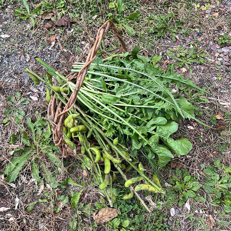 今宵のために収穫。秘伝豆、フェンネル、イタリアンパセリ、ルッコラ、サラダ用の葉2種。