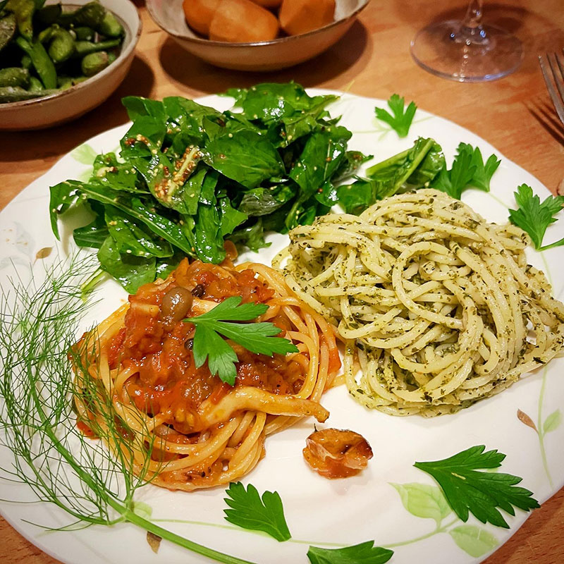 畑のホーリーバジルで作ったジェノベーゼのパスタとしめじとトマトのパスタの2色盛り。
