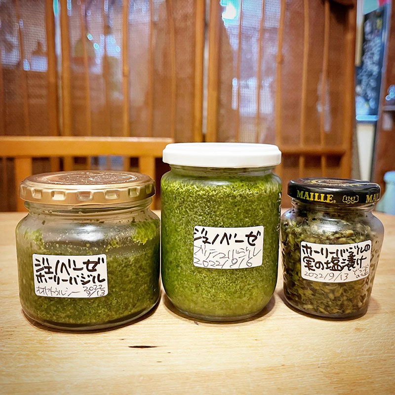 ジェノベーゼにはホーリーバジルの実の塩漬けを、トマトソースにはイタリアンパセリを散らして。皿にはフェンネルも。