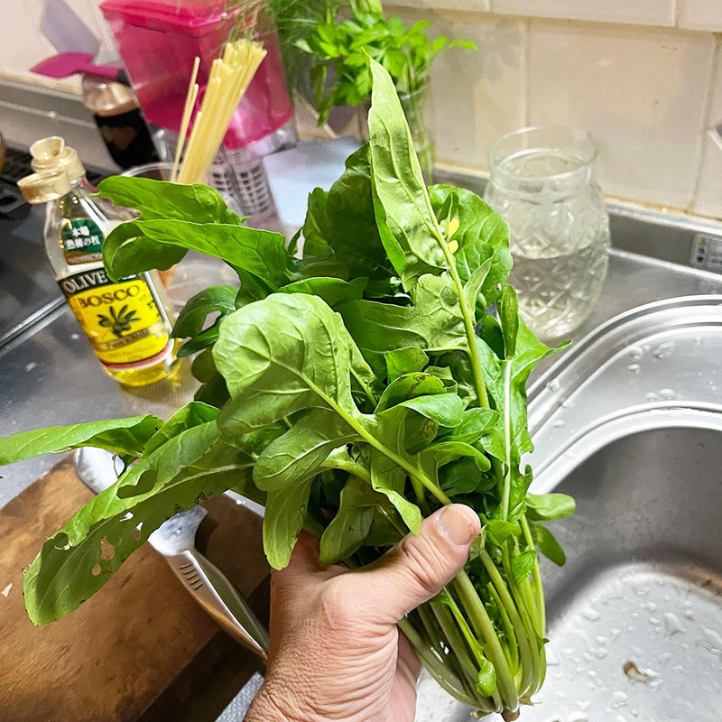 温かくてやたら元気な畑のルッコラに粒マスタードやホワイトビネガーやEXオリーブオイルのサラダも一皿に盛ってしまう。