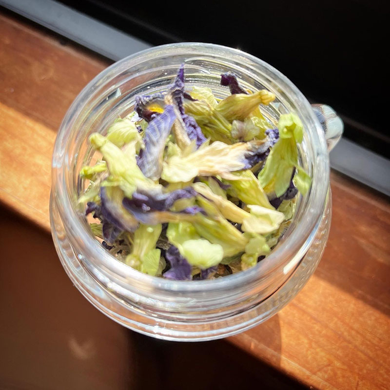 ひと夏で小さな瓶いっぱいに乾燥させた花を集めた。熱いお湯を注ぐと真っ青なハーブティーになるのがとてもきれい。