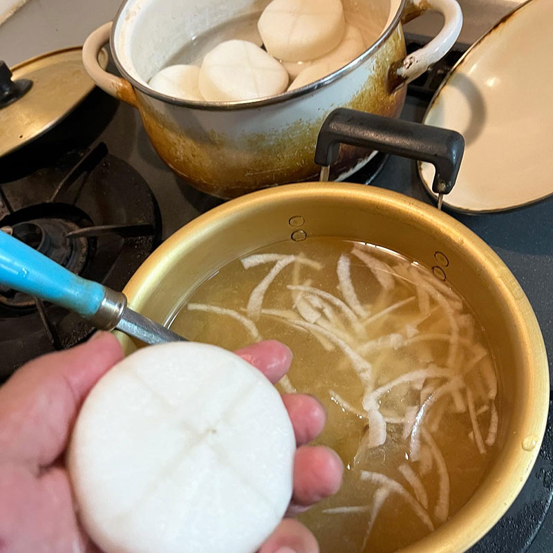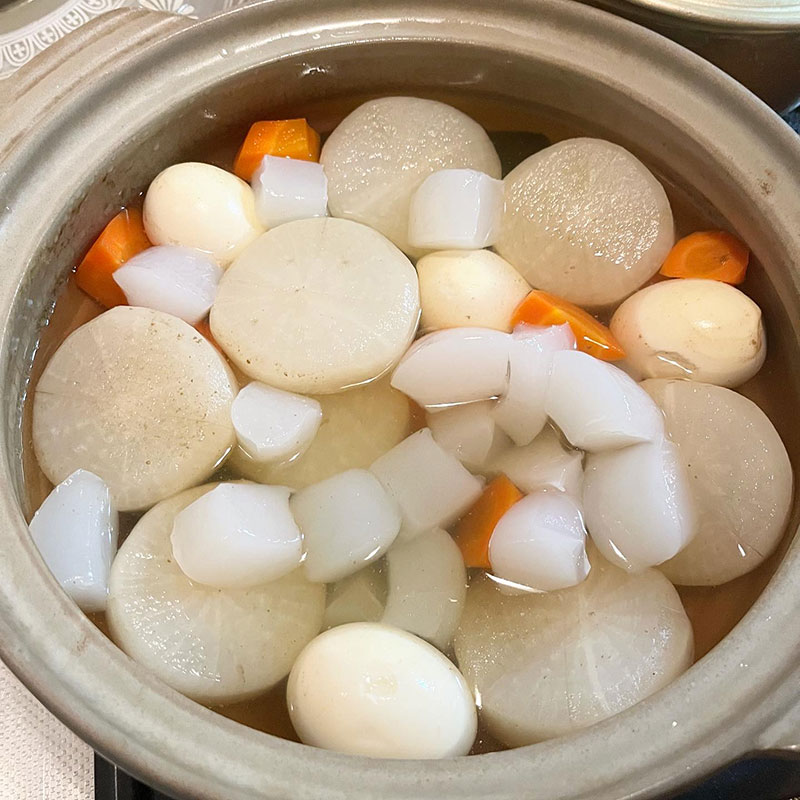 塩と出汁のおでんの汁作って下茹でした大根とにんじん、こんにゃく、ゆで卵を煮ておく。