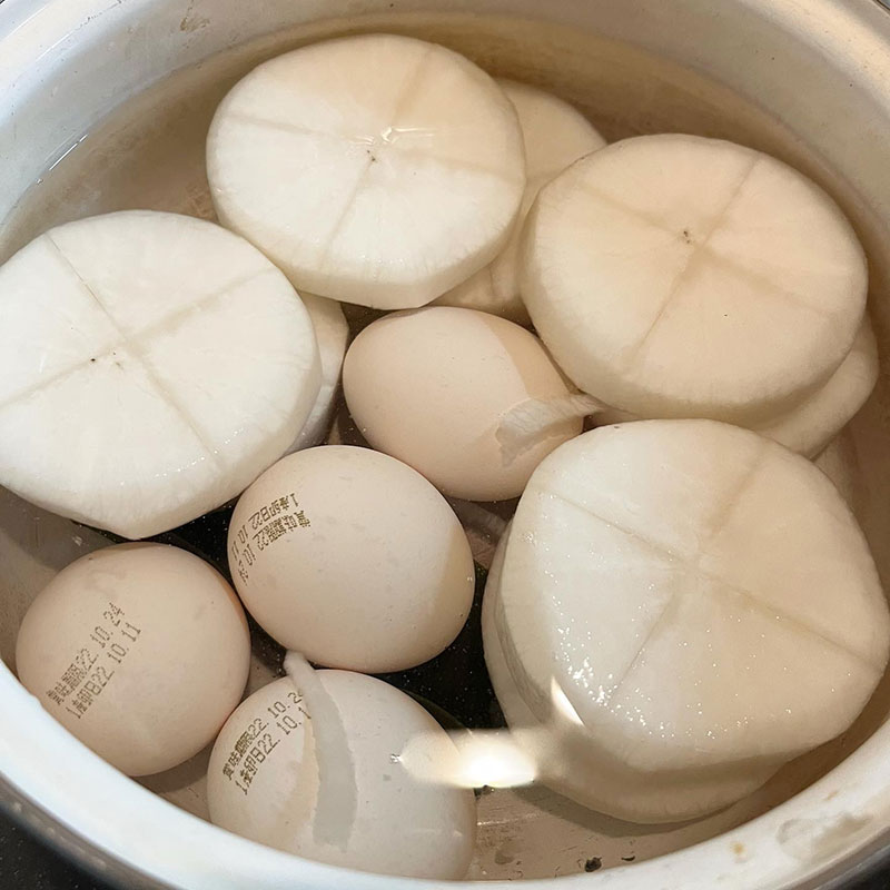 時短で卵の殻をよく洗って大根と一緒に煮てゆで卵作っちゃうけど