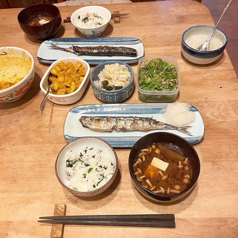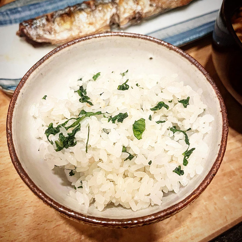大根菜飯と八丁味噌の味噌汁と。甘い甘い大根おろし。じゃがいものすりごまナムル。無限ピーマン。白菜漬け。