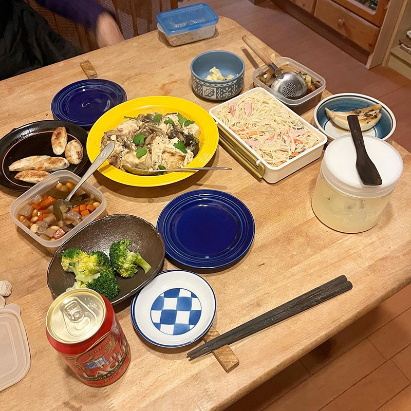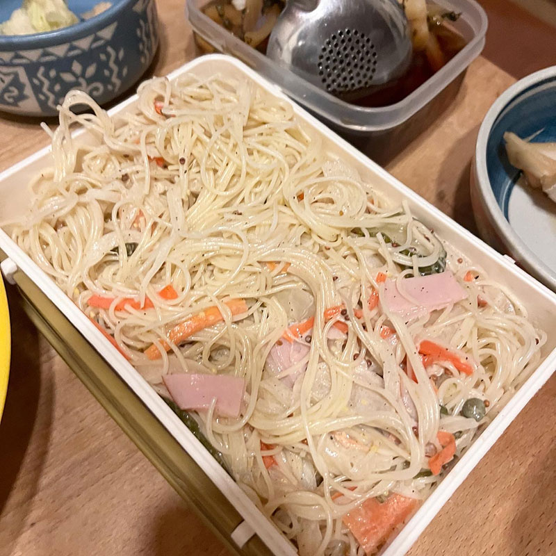 昨晩仕込んだマカロニをカッペリーニで作ったサラダと玉ねぎの麺つゆ漬け。五目豆。赤い金麦。